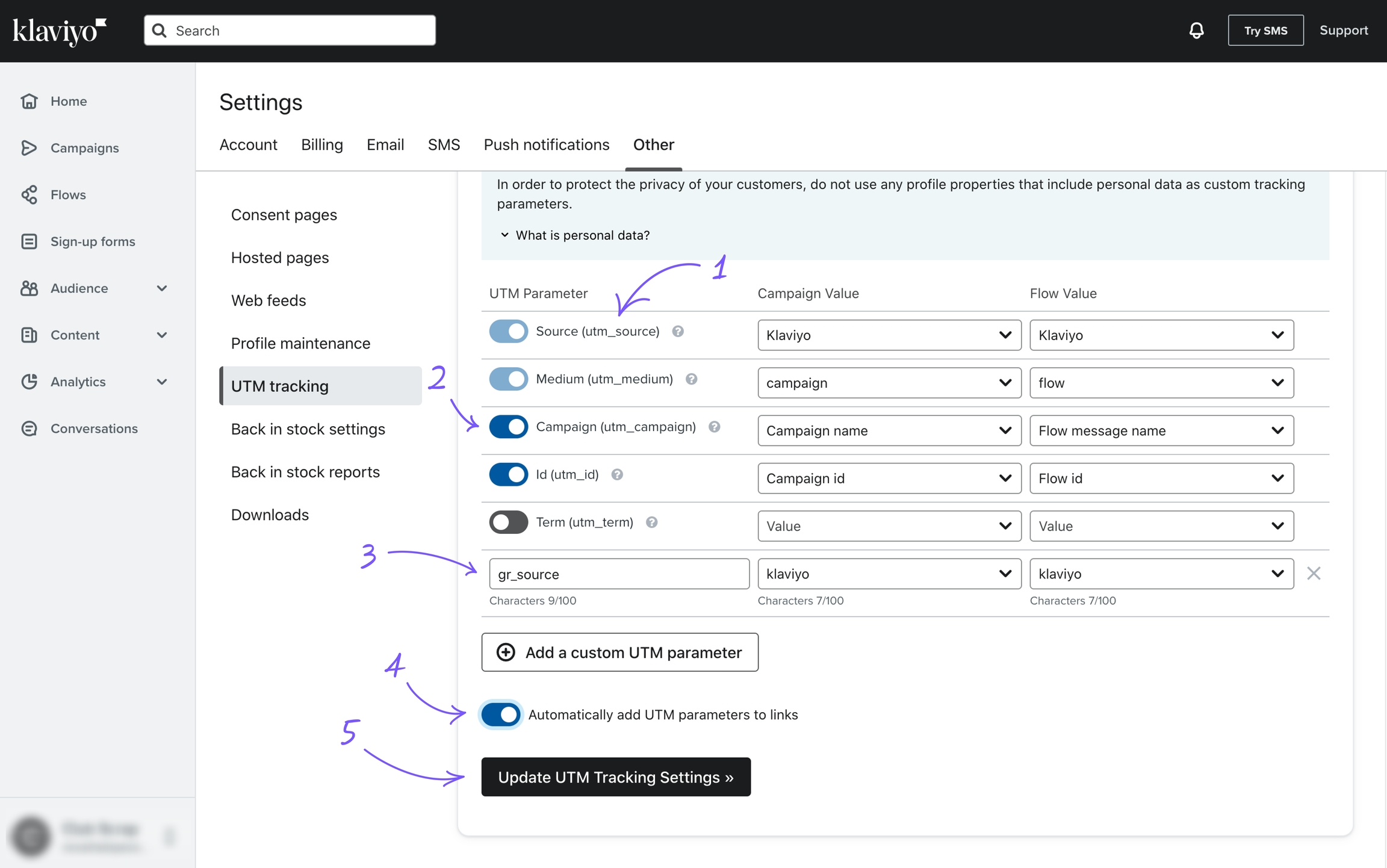 Growify natively integrates with Klaviyo API. Integrating your Klaviyo account with Growify allows you to track and analyze your email marketing performance more effectively. Follow these steps to enable UTM tracking in Klaviyo.