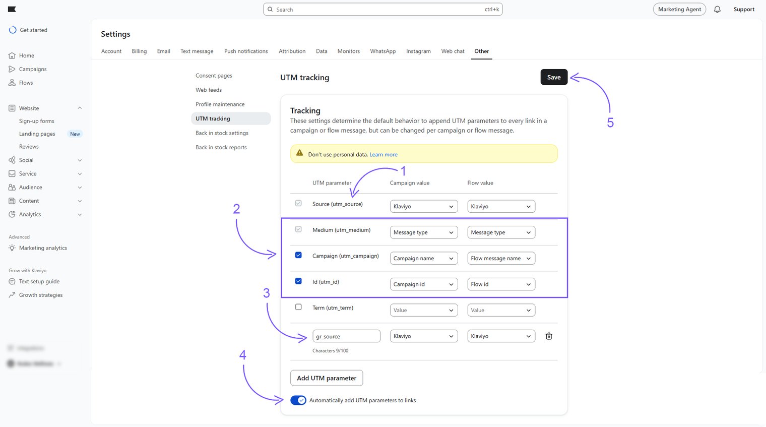 Growify natively integrates with Klaviyo API. Integrating your Klaviyo account with Growify allows you to track and analyze your email marketing performance more effectively. Follow these steps to enable UTM tracking in Klaviyo.