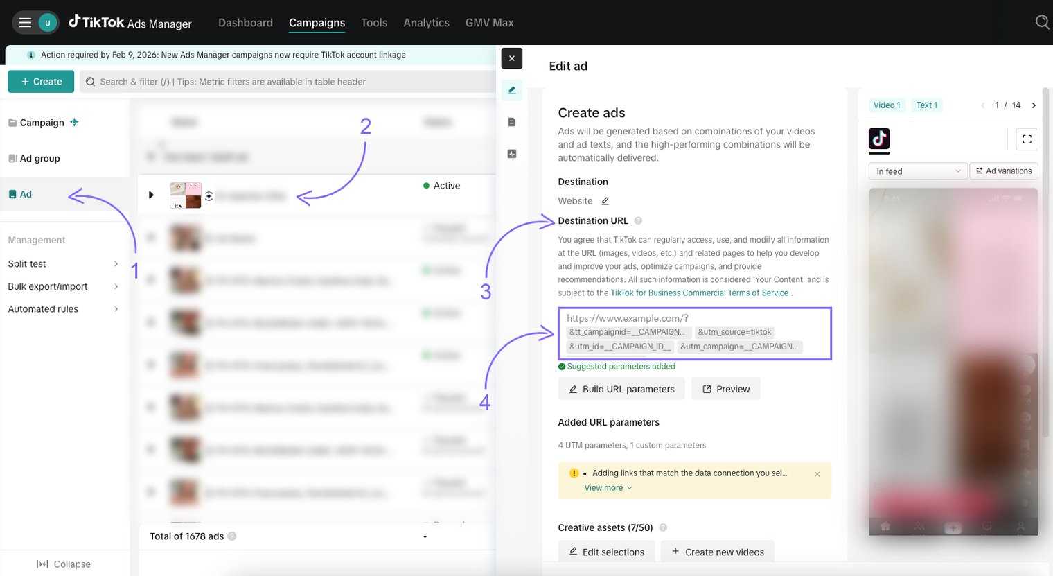 Make sure the destination URL contains a utm_source=tiktok. If the utm_source is not equal to "tiktok", please add a param &gr_source=tiktok at the end of your URL. Add this for new and existing ads.
